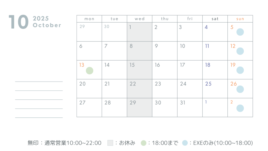 祝日は18:00までの営業 / 日曜はEXE会員のみ