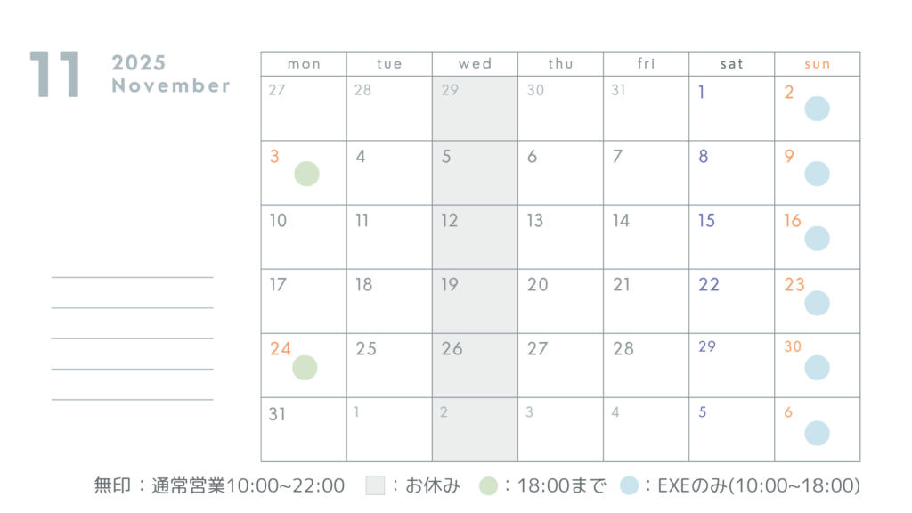 祝日は18:00までの営業 / 日曜はEXE会員のみ
