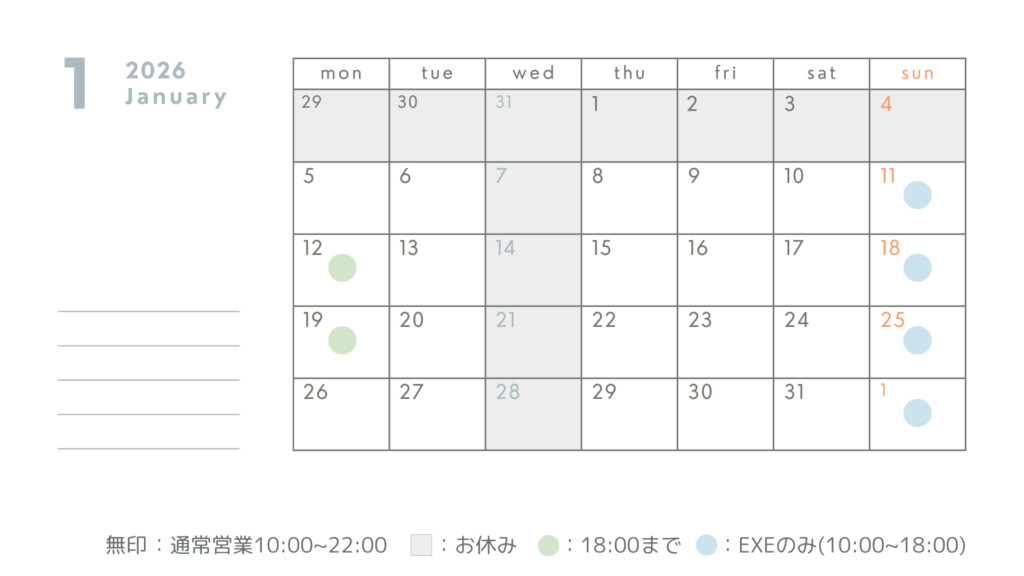 祝日は18:00までの営業 / 日曜はEXE会員のみ
