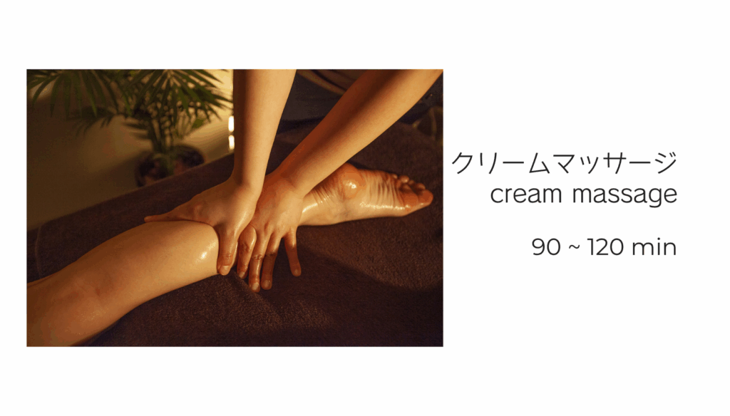 女性のエスティシャンとはまた違う、カラダのプロによるしっかりとした圧のクリームマッサージ。むくみがちな方や血行不良の方、冷えにお悩みの方は是非とも受けていただきたいです。軽めの刺激が好きな方は優しめに。ハードにしっかり流されたい方はそれなりに。施術の強さもお好みで自由自在です。