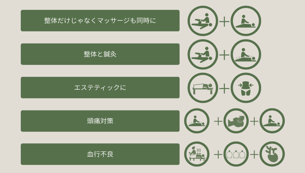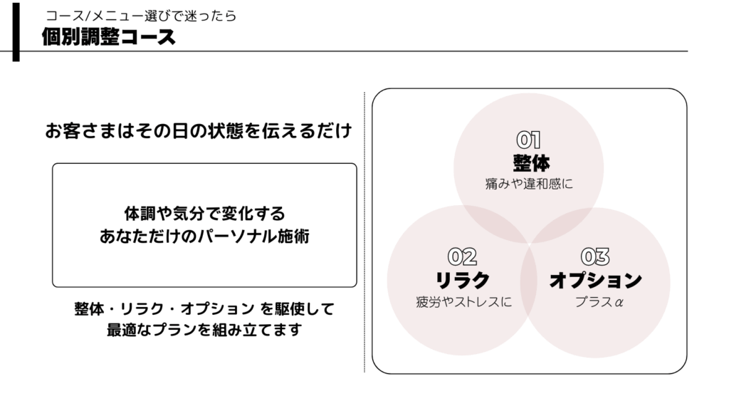 その日の体調や気分に合うよう、整体・リラク・温石セラピーや鍼灸などのオプション、当院のさまざまな施術を組み合わせた「おまかせ」施術です。
